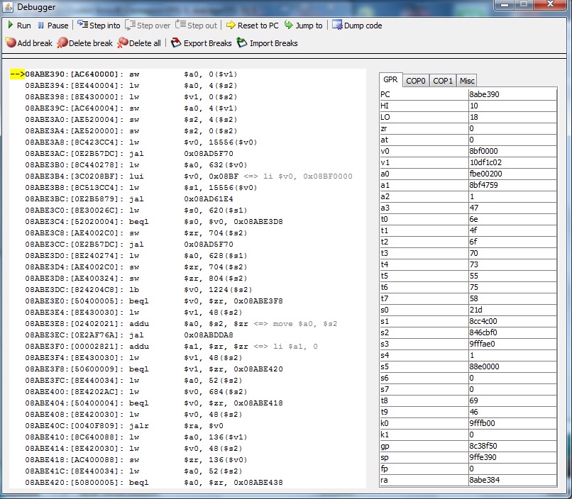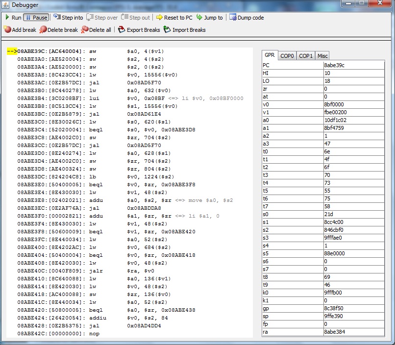 gp:0x08C38F50 sp:0x09FFE390 fp:0x00000000 ra:0x08ABE384