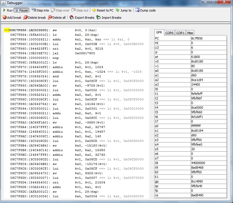 zr:0x00000000 at:0x00000001 v0:0xDEADC0DE v1:0x000B2400