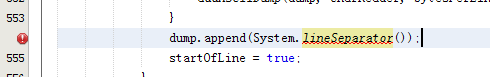 it should be "dump.append(System.getProperty("line.separator"));" I think.