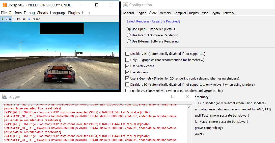 17:03:38 ERROR       ge - GUI - Too many NOP instructions executed (3001) at 0x08EFD340, list PspGeList[id=0x34, status=PSP_GE_LIST_DRAWING, list=0x090C9800, pc=0x08EFD340, stall=0x00000000, cbid=0x0, ended=false, finished=false, paused=false, restarted=true, reset=false]