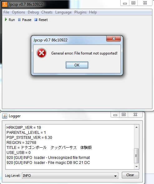 If I try to load the EBOOT.PBP through "Load file...", the emulator shows the message "General error: File format not supported!".