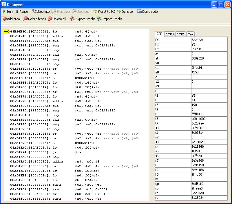 gp:0x08DD8AF0 sp:0x09FFEEA0 fp:0x08E284A8 ra:0x08A25084