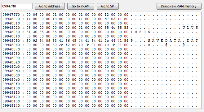 You got the wrong address. When you see the line I posted, press pause on the emulator, copy the address from "sceUtilitySavedataInitStart Address 0x09943ED0" (may be different), paste on the box on the upper left corner of memory viewer window and press "Go to address". That should be the save data contents used by the game for mode 8/sizes. Smile