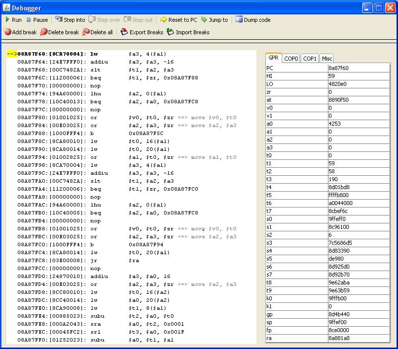 gp:0x08D4B440 sp:0x09FFEF00 fp:0x08CE0000 ra:0x08A881A8