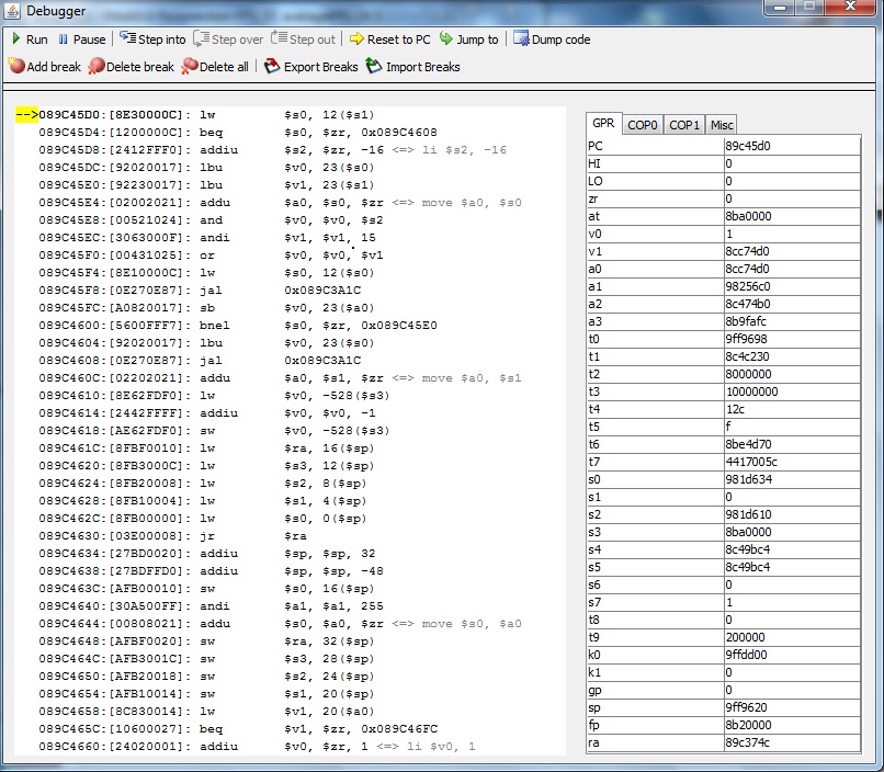 gp:0x00000000 sp:0x09FDDC60 fp:0x00000000 ra:0x08A8E220