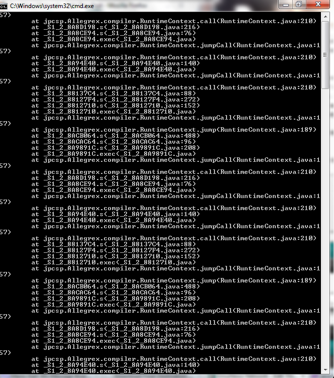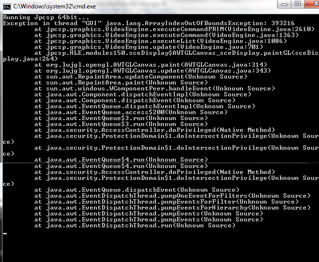 at _S1_2_8ACB064.s(_S1_2_8ACB064.java:488) at _S1_2_8ACAC64.s(_S1_2_8ACAC64.java:96) at _S1_2_8A9891C.s(_S1_2_8A9891C.java:208) at _S1_2_8A9891C.exec(_S1_2_8A9891C.java) at jpcsp.Allegrex.compiler.RuntimeContext.jumpCall(RuntimeContext.java:1 57) at jpcsp.Allegrex.compiler.RuntimeContext.call(RuntimeContext.java:210) at _S1_2_8A8D198.s(_S1_2_8A8D198.java:216) at _S1_2_8A8CE94.s(_S1_2_8A8CE94.java:76) at _S1_2_8A8CE94.exec(_S1_2_8A8CE94.java) at jpcsp.Allegrex.compiler.RuntimeContext.jumpCall(RuntimeContext.java:1 57) at jpcsp.Allegrex.compiler.RuntimeContext.call(RuntimeContext.java:210) at _S1_2_88136BC.s(_S1_2_88136BC.java:68) at _S1_2_88134CC.s(_S1_2_88134CC.java:64) at _S1_2_8813370.s(_S1_2_8813370.java:248) at _S1_2_88130AC.s(_S1_2_88130AC.java:76) at _S1_2_88138B0.s(_S1_2_88138B0.java:184) at _S1_2_8813998.s(_S1_2_8813998.java:112) at _S1_2_880BE44.s(_S1_2_880BE44.java:216) at _S1_2_880BBB4.s(_S1_2_880BBB4.java:36) at _S1_2_880BAEC.s(_S1_2_880BAEC.java:172) at _S1_2_8823988.s(_S1_2_8823988.java:40) at _S1_2_9E01FFC.s(_S1_2_9E01FFC.java:24) at _S1_2_8B1FDA0.s(_S1_2_8B1FDA0.java:4) at _S1_2_88184BC.s(_S1_2_88184BC.java:48) at _S1_2_881A85C.s(_S1_2_881A85C.java:768) at _S1_2_881A85C.exec(_S1_2_881A85C.java) at jpcsp.Allegrex.compiler.RuntimeContext.jumpCall(RuntimeContext.java:1 57) at jpcsp.Allegrex.compiler.RuntimeContext.jump(RuntimeContext.java:189) at _S1_2_883D014.s(_S1_2_883D014.java:48) at _S1_2_883CE04.s(_S1_2_883CE04.java:128) at _S1_2_8984CC0.s(_S1_2_8984CC0.java:144) at _S1_2_8984C70.s(_S1_2_8984C70.java:244) at _S1_2_8984C70.exec(_S1_2_8984C70.java) at jpcsp.Allegrex.compiler.RuntimeContext.jumpCall(RuntimeContext.java:1 57) at jpcsp.Allegrex.compiler.RuntimeContext.jump(RuntimeContext.java:189) at _S1_2_8ACB064.s(_S1_2_8ACB064.java:488) at _S1_2_8ACAC64.s(_S1_2_8ACAC64.java:96) at _S1_2_8A9891C.s(_S1_2_8A9891C.java:208) at _S1_2_8A9891C.exec(_S1_2_8A9891C.java) at jpcsp.Allegrex.compiler.RuntimeContext.jumpCall(RuntimeContext.java:1 57) at jpcsp.Allegrex.compiler.RuntimeContext.call(RuntimeContext.java:210) at _S1_2_8A8D198.s(_S1_2_8A8D198.java:216) at _S1_2_8A8CE94.s(_S1_2_8A8CE94.java:76) at _S1_2_8A8CE94.exec(_S1_2_8A8CE94.java) at jpcsp.Allegrex.compiler.RuntimeContext.jumpCall(RuntimeContext.java:1 57) at jpcsp.Allegrex.compiler.RuntimeContext.call(RuntimeContext.java:210) at _S1_2_8A94E40.s(_S1_2_8A94E40.java:140) at _S1_2_8A94E40.exec(_S1_2_8A94E40.java) at jpcsp.Allegrex.compiler.RuntimeContext.jumpCall(RuntimeContext.java:1 57) at jpcsp.Allegrex.compiler.RuntimeContext.call(RuntimeContext.java:210) at _S1_2_9DED220.s(_S1_2_9DED220.java:64) at _S1_2_9DE992C.s(_S1_2_9DE992C.java:24) at _S1_2_9DE992C.exec(_S1_2_9DE992C.java) at jpcsp.Allegrex.compiler.RuntimeContext.jumpCall(RuntimeContext.java:1 57) at jpcsp.Allegrex.compiler.RuntimeContext.jump(RuntimeContext.java:189) at _S1_2_8ACB064.s(_S1_2_8ACB064.java:488) at _S1_2_8ACAC64.s(_S1_2_8ACAC64.java:96) at _S1_2_8A9891C.s(_S1_2_8A9891C.java:208) at _S1_2_8A9891C.exec(_S1_2_8A9891C.java) at jpcsp.Allegrex.compiler.RuntimeContext.jumpCall(RuntimeContext.java:1 57) at jpcsp.Allegrex.compiler.RuntimeContext.call(RuntimeContext.java:210) at _S1_2_8A8D198.s(_S1_2_8A8D198.java:216) at _S1_2_8A8CE94.s(_S1_2_8A8CE94.java:76) at _S1_2_8A8CE94.exec(_S1_2_8A8CE94.java) at jpcsp.Allegrex.compiler.RuntimeContext.jumpCall(RuntimeContext.java:1 57) at jpcsp.Allegrex.compiler.RuntimeContext.call(RuntimeContext.java:210) at _S1_2_8A94E40.s(_S1_2_8A94E40.java:140) at _S1_2_8A94E40.exec(_S1_2_8A94E40.java) at jpcsp.Allegrex.compiler.RuntimeContext.jumpCall(RuntimeContext.java:1 57) at jpcsp.Allegrex.compiler.RuntimeContext.call(RuntimeContext.java:210) at _S1_2_8813AD4.s(_S1_2_8813AD4.java:172) at _S1_2_8813A0C.s(_S1_2_8813A0C.java:152) at _S1_2_8813A0C.exec(_S1_2_8813A0C.java) at jpcsp.Allegrex.compiler.RuntimeContext.jumpCall(RuntimeContext.java:1 57) at jpcsp.Allegrex.compiler.RuntimeContext.jump(RuntimeContext.java:189) at _S1_2_8ACB064.s(_S1_2_8ACB064.java:488) at _S1_2_8ACAC64.s(_S1_2_8ACAC64.java:96) at _S1_2_8A9891C.s(_S1_2_8A9891C.java:208) at _S1_2_8A9891C.exec(_S1_2_8A9891C.java) at jpcsp.Allegrex.compiler.RuntimeContext.jumpCall(RuntimeContext.java:1 57) at jpcsp.Allegrex.compiler.RuntimeContext.call(RuntimeContext.java:210) at _S1_2_8A8D198.s(_S1_2_8A8D198.java:216) at _S1_2_8A8CE94.s(_S1_2_8A8CE94.java:76) at _S1_2_8A8CE94.exec(_S1_2_8A8CE94.java) at jpcsp.Allegrex.compiler.RuntimeContext.jumpCall(RuntimeContext.java:1 57) at jpcsp.Allegrex.compiler.RuntimeContext.call(RuntimeContext.java:210) at _S1_2_8A94E40.s(_S1_2_8A94E40.java:140) at _S1_2_8A94E40.exec(_S1_2_8A94E40.java) at jpcsp.Allegrex.compiler.RuntimeContext.jumpCall(RuntimeContext.java:1 57) at jpcsp.Allegrex.compiler.RuntimeContext.call(RuntimeContext.java:210) at _S1_2_88137C4.s(_S1_2_88137C4.java:88) at _S1_2_88127F4.s(_S1_2_88127F4.java:272) at _S1_2_8812710.s(_S1_2_8812710.java:152) at _S1_2_8812710.exec(_S1_2_8812710.java) at jpcsp.Allegrex.compiler.RuntimeContext.jumpCall(RuntimeContext.java:1 57) at jpcsp.Allegrex.compiler.RuntimeContext.jump(RuntimeContext.java:189) at _S1_2_8ACB064.s(_S1_2_8ACB064.java:488) at _S1_2_8ACAC64.s(_S1_2_8ACAC64.java:96) at _S1_2_8A9891C.s(_S1_2_8A9891C.java:208) at _S1_2_8A9891C.exec(_S1_2_8A9891C.java) at jpcsp.Allegrex.compiler.RuntimeContext.jumpCall(RuntimeContext.java:1 57) at jpcsp.Allegrex.compiler.RuntimeContext.call(RuntimeContext.java:210) at _S1_2_8A8D198.s(_S1_2_8A8D198.java:216) at _S1_2_8A8CE94.s(_S1_2_8A8CE94.java:76) at _S1_2_8A8CE94.exec(_S1_2_8A8CE94.java) at jpcsp.Allegrex.compiler.RuntimeContext.jumpCall(RuntimeContext.java:1 57) at jpcsp.Allegrex.compiler.RuntimeContext.call(RuntimeContext.java:210) at _S1_2_8A94E40.s(_S1_2_8A94E40.java:140) at _S1_2_8A94E40.exec(_S1_2_8A94E40.java) at jpcsp.Allegrex.compiler.RuntimeContext.jumpCall(RuntimeContext.java:1 57) at jpcsp.Allegrex.compiler.RuntimeContext.call(RuntimeContext.java:210) at _S1_2_88137C4.s(_S1_2_88137C4.java:88) at _S1_2_88127F4.s(_S1_2_88127