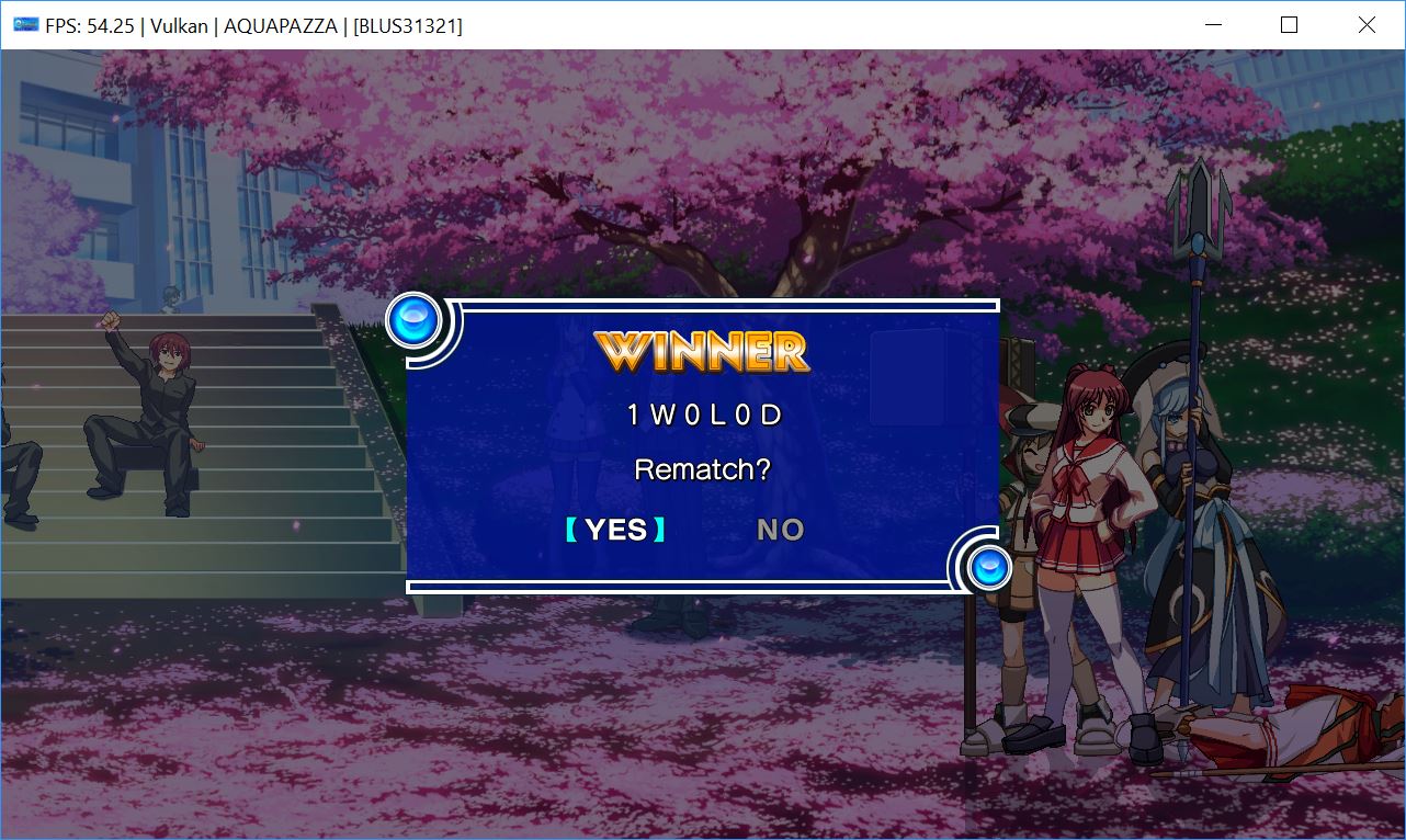 V+Int(f)+Rec(ASMJIT): "Ingame" 540FPS during intro cutscene, 250 FPS on Title Screen, 53FPS on Character Select Screen. 85FPS during Main Menu. 35-60FPS during matches. RPCS3 brings up two Segfault error windows that can be ignored, but will crash if Stop is pressed.