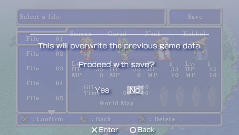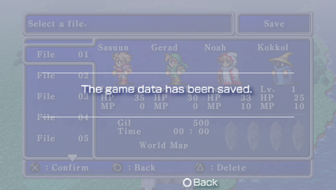 3) The "O Back" doesn't appear on the bottom of the screen when the message "The game data has been saved." appears. The screen needs to be more transparent in comparison to how it appears on the PSP. (1st Screenshot - JPCSP, 2nd Screenshot - PSP)