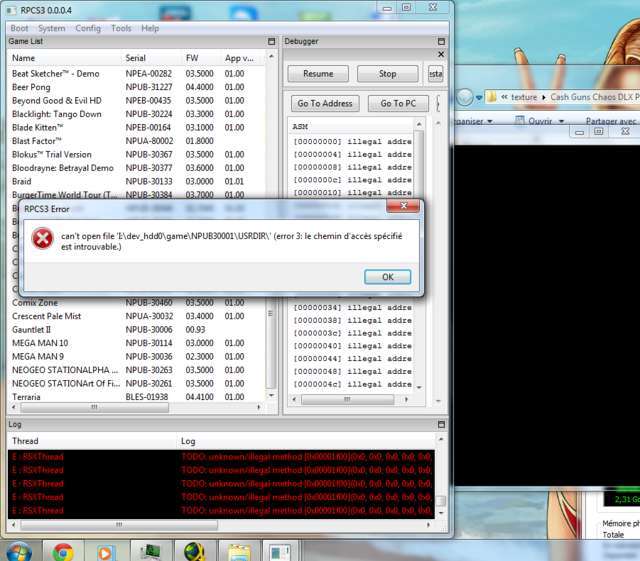 Specs: i7-4770 | GTX 1080 | 32GB DDR3 | Windows 10 x64 Status: Nothing Settings: --Core: Automatically load required libraries Graphics: 1280x720 | 16x9 | Frame limit Off | Use GPU texture scaling Audio: XAudio2 Input/Output: XInput (Using an official PS3 controller with SCPToolkit drivers) Tested on 6 combinations of the Renderer, PPU, and SPU configurations. OPENGL OGL+Int(f)+Int(p): Can't boot. White Screen. Stuck on F {PPU[0x1000000] Thread (main_thread) [0x003da1c8]} class std::runtime_error thrown: Unimplemented (in file C:\rpcs3\rpcs3\Emu\Cell\Modules\cellGcmSys.cpp:1203) OGL+Int(f)+Int(f): Can't boot. White Screen. Stuck on F {PPU[0x1000000] Thread (main_thread) [0x003da1c8]} class std::runtime_error thrown: Unimplemented (in file C:\rpcs3\rpcs3\Emu\Cell\Modules\cellGcmSys.cpp:1203) OGL+Int(f)+Rec(ASMJIT): Can't boot. White Screen.Stuck on F {PPU[0x1000000] Thread (main_thread) [0x003da1c8]} class std::runtime_error thrown: Unimplemented (in file C:\rpcs3\rpcs3\Emu\Cell\Modules\cellGcmSys.cpp:1203) OGL+Rec(LLVM)+Int(p): Can't boot. White Screen. Stuck on F {PPU[0x1000000] Thread (main_thread) [0x00010230]} class std::runtime_error thrown: Unimplemented (in file C:\rpcs3\rpcs3\Emu\Cell\Modules\cellGcmSys.cpp:1203) OGL+Rec(LLVM)+Int(f): Can't boot. White Screen. Stuck on F {PPU[0x1000000] Thread (main_thread) [0x00010230]} class std::runtime_error thrown: Unimplemented (in file C:\rpcs3\rpcs3\Emu\Cell\Modules\cellGcmSys.cpp:1203) OGL+Rec(LLVM)+Rec(ASMJIT): Can't boot. White Screen. Stuck on F {PPU[0x1000000] Thread (main_thread) [0x00010230]} class std::runtime_error thrown: Unimplemented (in file C:\rpcs3\rpcs3\Emu\Cell\Modules\cellGcmSys.cpp:1203)