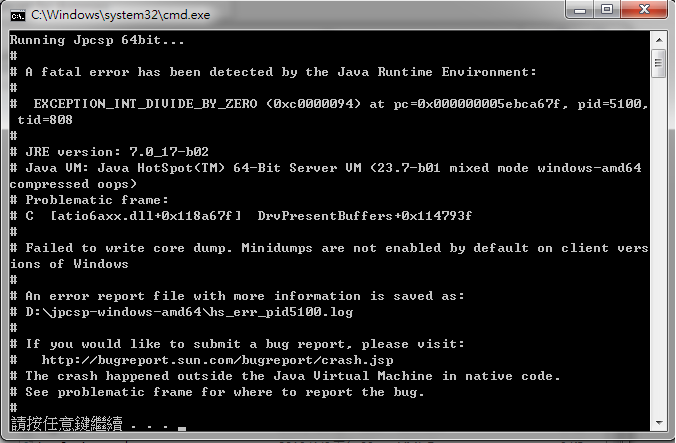 # A fatal error has been detected by the Java Runtime Environment: # EXCEPTION_INT_DIVIDE_BY_ZERO (0xc0000094) at pc=0x000000006316a67f, pid=4640, tid=3860 # JRE version: 7.0_17-b02 # Java VM: Java HotSpot 64-Bit Server VM (23.7-b01 mixed mode windows-amd64 compressed oops) # Problematic frame: # C [atio6axx.dll+0x118a67f] DrvPresentBuffers+0x114793f # Failed to write core dump. Minidumps are not enabled by default on client versions of Windows