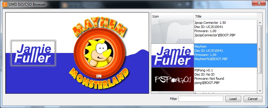 This homebrew game was tested with revision 920f5a4. With regards to the emulator, there seems to be an issue where the UMD ISO/CSO Browser can't properly identify homebrew games which require two or more folders (1st Screenshot). The archive for the homebrew game contains the folders "Mayhem" & "Mayhem%" (2nd Screenshot) and the UMD ISO/CSO Browser only recognizes the second folder. In order to load the homebrew, the user must click File -> Load file... (or Alt+O) and click on the "Mayhem" folder.