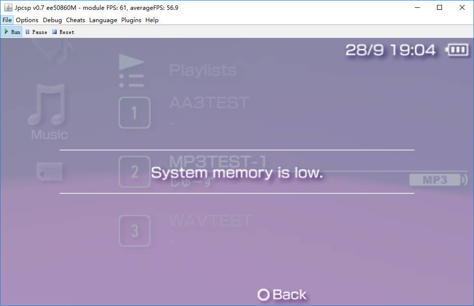 19:04:49  INFO hle.IoFileMgrForUser - CommonAudioStateManagerDispatchT - hleIoOpen filename = ms0:/MUSIC/MP3TEST-1.MP3 flags = 1 permissions = 0400
