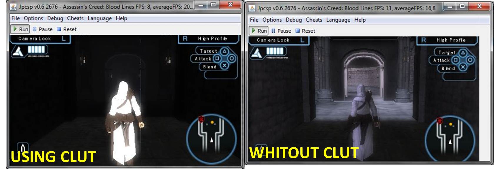 Using CLUT whit GE Graphics options does not boost the game; in fact, letting CLUT option enabled will glitch the game graphic.