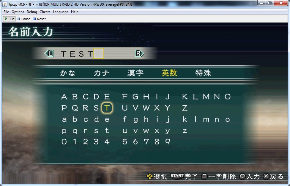This game was tested with r3731 and External Software Renderer d09b9fd. Although the game works fine for the most part as an ISO file, JPCSP has trouble booting the game as an EBOOT.PBP. Most of the time the emulator will crash when attempting to load this game with an EBOOT file. A common issue that still occurs is that the emulator freezes when the player attempts to switch characters (lots of warnings appear if External Software Renderer is used; freezes on OpenGL as well but no warnings appear).
