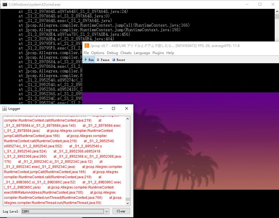 Code: Running Jpcsp 64bit...(03-23-2017, 02:40 PM)onelight Wrote: can't run any games!Could you please post a complete INFO log file? It seems that there is an issue before that exception as the game is trying to allocate memory with an incorrect partitionId. The best would be to enable the DEBUG log level just before (2-3 seconds) the exception is being displayed. Thank you! EDIT: the exception should be fixed in ed61cef, but I still would like to see the log file to follow-up on this behavior.