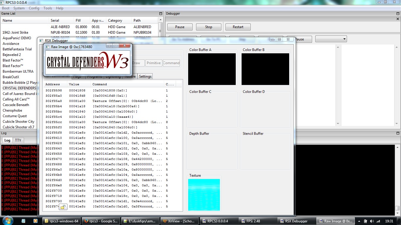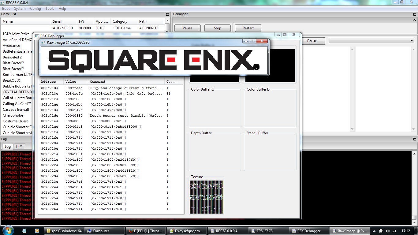 Japan version. Game shows some textures in rsx debugger, then some menus on screen - without depth and color buffers. I manually stopped game after windows message of lack memory (ram?), maybe memory leak.