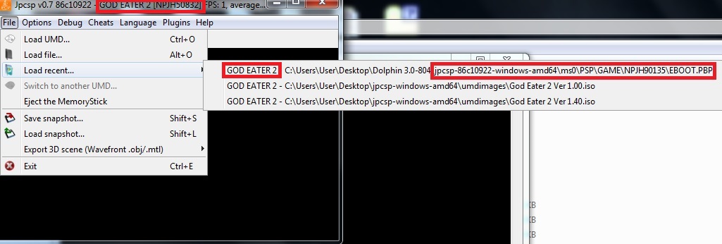 As you can see on the below screenshots, I'm trying to load the game Dragon Ball Tag Versus Trial (NPJH90135) from the UMD Browser (1st Screenshot). If the command line option "--bufferumd" is in the startup batch file, JPCSP will load the previous game from the "Load recent..." list instead (God Eater 2) since it's in ISO format (2nd Screenshot). If "--bufferumd" isn't in the startup batch file, games/applications in EBOOT.PBP format will be able to load properly in JPCSP (3rd Screenshot).