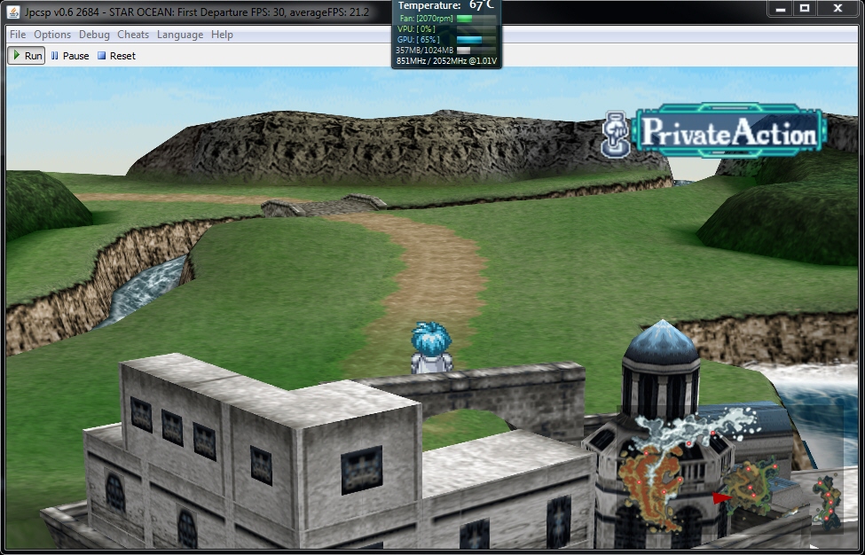 Color Mask (needed to show the characters in the towns) can really stress the video card on the games world map, causing the GPU load to 90-100%, though you can quickly go to jpcsp's configuration and turn this off temporarily while outside of towns.