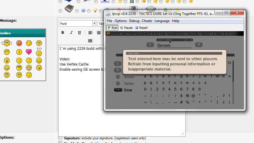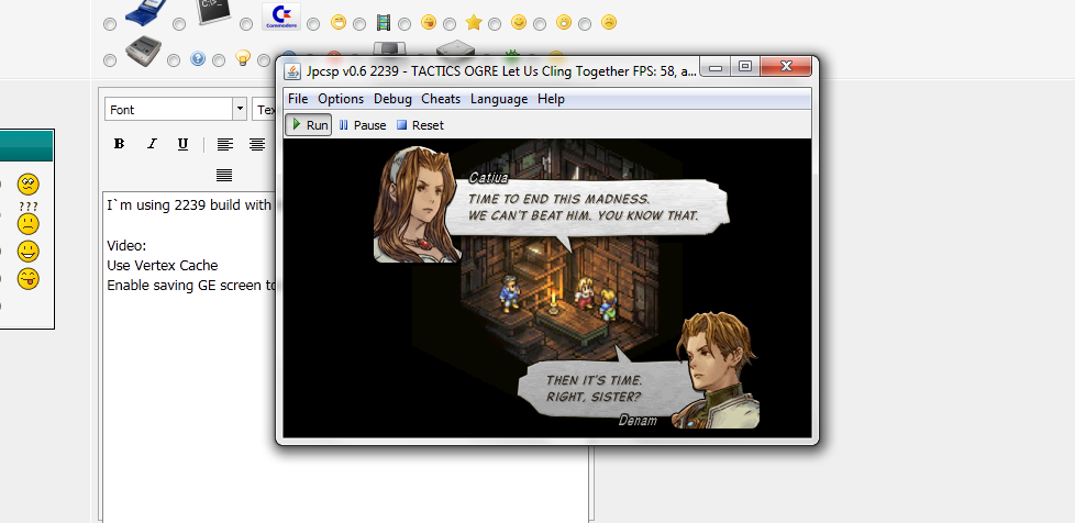 ' Wrote:The game is playable (bit slow on menus) but that happens when entering in Almorica... I´m going to upload a video! Thanks for the update, what build of JPCSP are you using? What are your system specs? I tried it with the most recent version 2239, and it ran moderately well on Windows XP up until the first battle. Certain parts of the screen started to freeze up or unfreeze randomly, it was playable but very annoying.