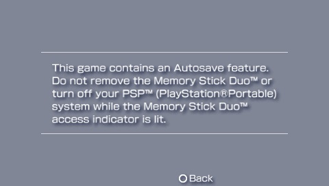 message 'This game contains an Autosave feature. Do not remove the Memory Stick Duo™ or turn off your PSP™ (PlayStation®Portable) system while the Memory Stick Duo™ access indicator is lit.'