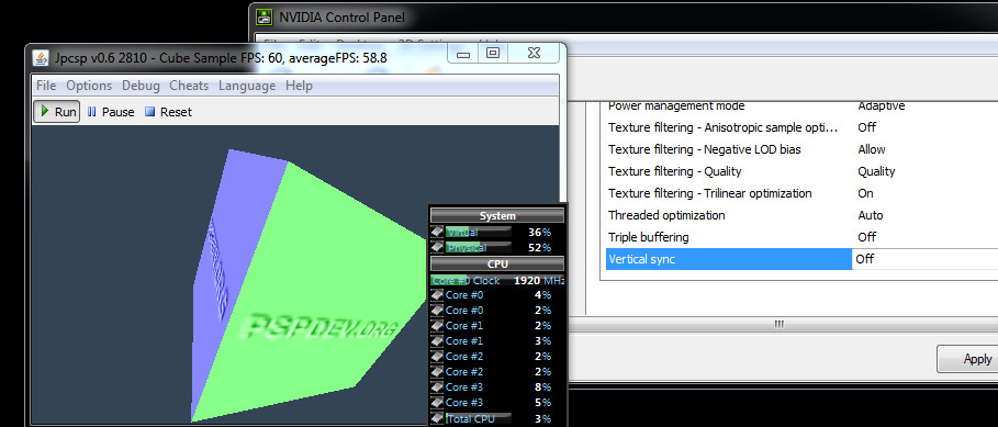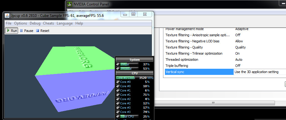 Actually looking into this problem some more, it seems the high cpu usage could be related to the nvidia drivers, when forcing vsync to 'off' in the nvidia control panel the cpu usage is very low with jpcsp again (basically idle with the cube demo).