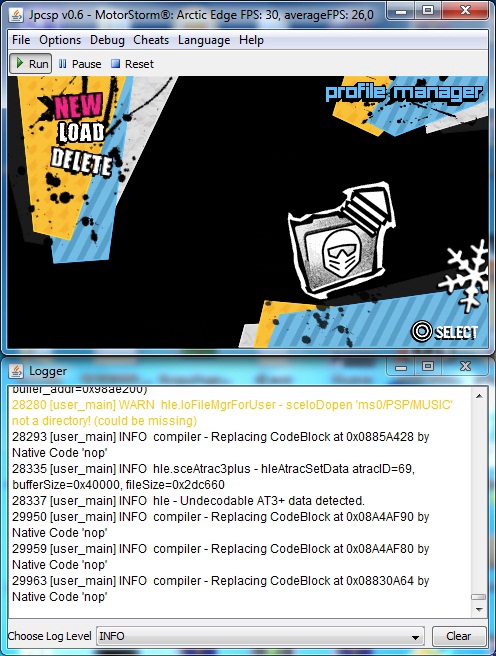 28280 [user_main] WARN hle.IoFileMgrForUser - sceIoDopen 'ms0/PSP/MUSIC' not a directory! (could be missing)