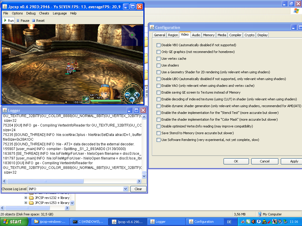 JPCSP games tested with Athlon X2 4850e, 4 GB RAM, Radeon HD 3300 (onboard), OpenGL: 3.3.11653, Windows XP SP3 32-bit PPSSPP games tested with Intel i3, 4 GB RAM, Intel HD Graphics 2000 (onboard), OpenGL: 3.1.0 Build 6.14.10.5421, Windows XP SP3 32-bit