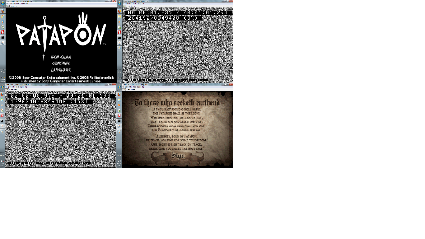 2. download latest jpcsp (windows 32bit version) from http://buildbot.orphis.net/jpcsp/ or download r1985 that for me the best jpcsp to play patapon 2 3. extract it to a folder 4. start jpcsp with start-windows-x86.bat file 5. open configurations: options/configuration 6. on Video tab: uncheck all 7. on Media tab: check "Use Media Engine" and "Decode with SonicStage" 8. start patapon2 9. have fun!