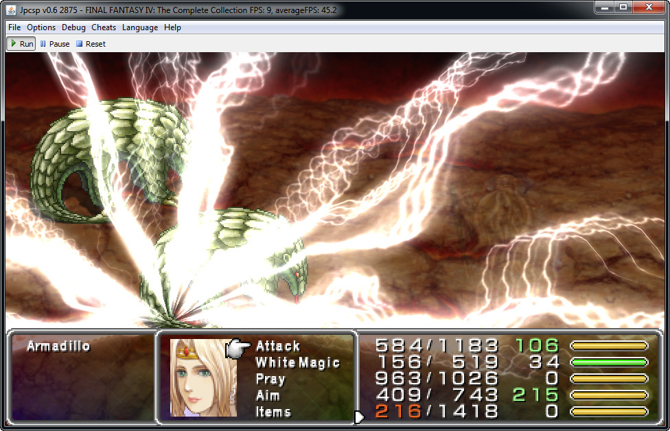 The problem I really care about is that what happens onscreen seems to be a bit slow, as emphasized by when Cecil uses Blue Fang in the intro bit, the sound effect plays, and ends, whilst the Lightning effect continues playing, fairly slowly at that. The FPS reads anywhere from 20-22, and very occasionally 23 as I'm going through the game, while this doesn't bother me too badly, I do get annoyed by this when it comes to the spells, having the animation playing long enough that the sound effect could loop twice.