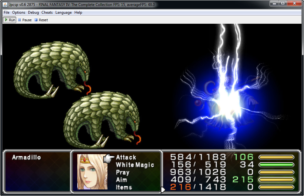 The problem I really care about is that what happens onscreen seems to be a bit slow, as emphasized by when Cecil uses Blue Fang in the intro bit, the sound effect plays, and ends, whilst the Lightning effect continues playing, fairly slowly at that. The FPS reads anywhere from 20-22, and very occasionally 23 as I'm going through the game, while this doesn't bother me too badly, I do get annoyed by this when it comes to the spells, having the animation playing long enough that the sound effect could loop twice.
