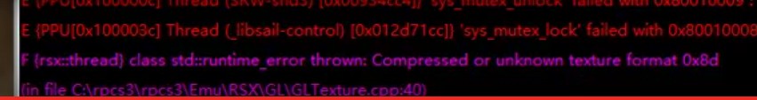 F {PPU[0x1000000] Thread (main_thread) [0x00a0b1a8]} class std::runtime_error thrown: Locking failed (lwmutex=*0x23414358, owner=0xfffffffc) (in file C:\rpcs3\rpcs3\Emu\Cell\Modules\sys_lwcond_.cpp:258)