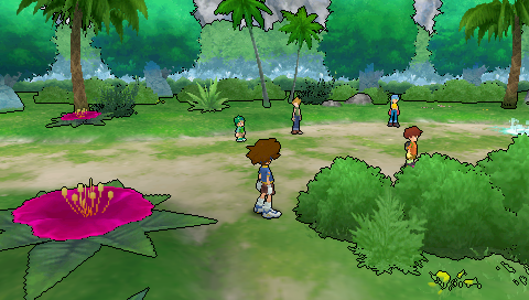 The other issue is how objects and the surrounding background have lines traced on them. On the PSP (1st Screenshot), only the character models have lines traced on them. With OpenGL (2nd Screenshot), the lines are traced on anything that appears in the environment. Even if none of the options are selected on OpenGL, the lines still appear on everything. If the option "Enable the shader implementation for the "Stencil Test" (more accurate but slower)" is selected, the lines disappear from everything (including the character models). The External Software Renderer (3rd Screenshot) does the best job of resembling the scene that is shown on PSP with the exception of a slight lighting issue (the ground and grass nearest to the character on the upper left is darker on the PSP) and vertical dotted lines that may appear on the center of a character's face.