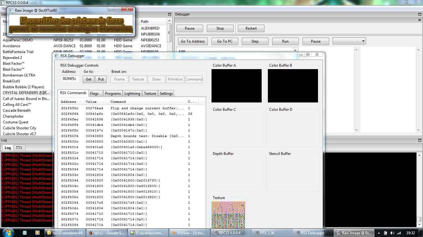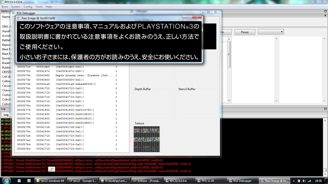 Japan version. Game shows some textures in rsx debugger, then some menus on screen - without depth and color buffers. I manually stopped game after windows message of lack memory (ram?), maybe memory leak.