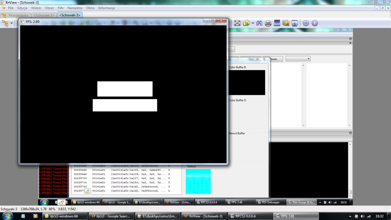 OMG, this game is really demanding. I closed all programs but rpcs3 ofc. I had no windows message of lack mem this time. I passed the black/white screen and then black-only screen appeared with different fps, so something happened. After a short while, game crashed instantly with: memory cant point to adress error or something. It was not like rpcs3 error, maybe visualstudio one. I have 4GB, after this error i had 2,98GB ram usage. During game run, my video RAM was reaching 92%! from time to time, i have 512 MB on GPU, amazing. I saw slowdowns of log and mouse pointer when moving, i believe video memory might been transferred from gpu ram to system ram by slow pci bus, slowdowns were looking similar to this behaviour.