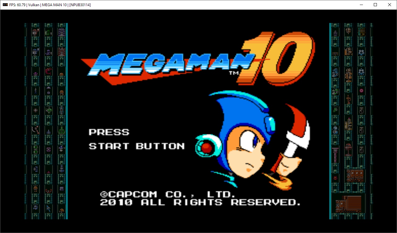 PPU decoder: Recompiler (LLVM) SPU decoder: Recompiler (ASMJIT) Load liblv2.sprx only GPU settings: OpenGL; Vulkan @ 1280x720 w/ VSync, Frame limit set to 60 Audio settings: XAudio2 Input/Output: DualShock 4 Just like Mega Man 9, the game runs perfectly at full speed 100% of time for me. I couldn't find a single glitch or issue using either OpenGL or Vulkan. In Mega Man 9, I experienced some sound artifacts (cracking) when using Vulkan; this doesn't seem to happen in Mega Man 10. Absolutely playable!
