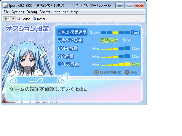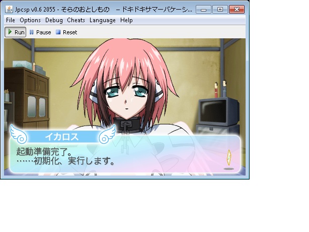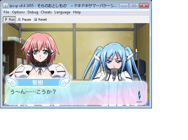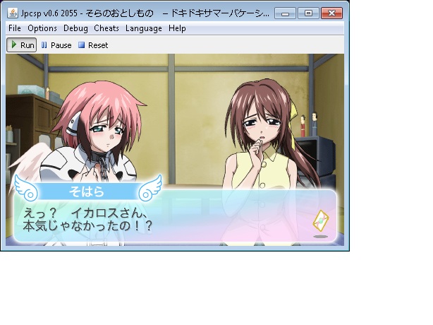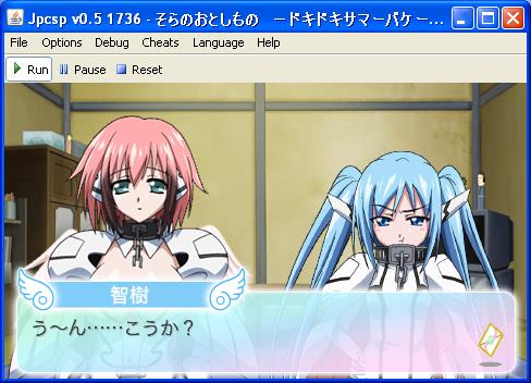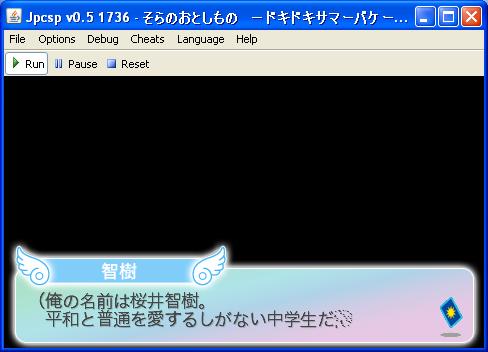 There are errors in showing the pictures, it goes black for a very short time and then shows the picture (so to say it flickers), it shows then the message "sceGeListEnQueue can't enqueue duplicate list" and sometime even "PSP_GE_LIST_STALL_REACHED" but it always goes further (unlike other games I encountered with that message), at the start you have to say "NO" to the savegame, right after the menu again "NO"; with voice and music, it has also some distortions during drawing the pictures, also problems with some kanji symbols not correctly drawn in the text